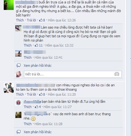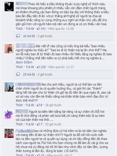 Những dân mạng lấy lý lẽ quen thuộc khi "ném đá" những ngôi sao, nghệ sĩ rằng hiện nay còn rất nhiều người nghèo khổ, khó khăn. Chính vì thế mà nên dùng số tiền hưởng thụ cuộc sống xa hoa, đẳng cấp của mình để đi làm từ thiện hoặc giúp đỡ người nghèo.