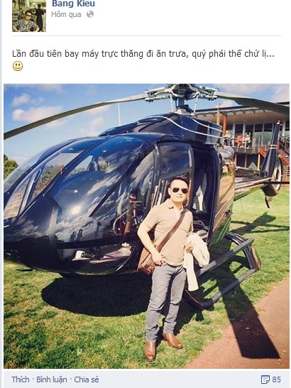 Háo hức với điều thú vị này, Bằng Kiều chia sẻ rất nhiều hình ảnh trên trang cá nhân. Trong đó, có một bức hình Bằng Kiều đứng chụp phía ngoài trực thăng và chú thích: "Lần đầu tiên bay máy trực thăng đi ăn trưa, quý phái thế chứ lị... ".