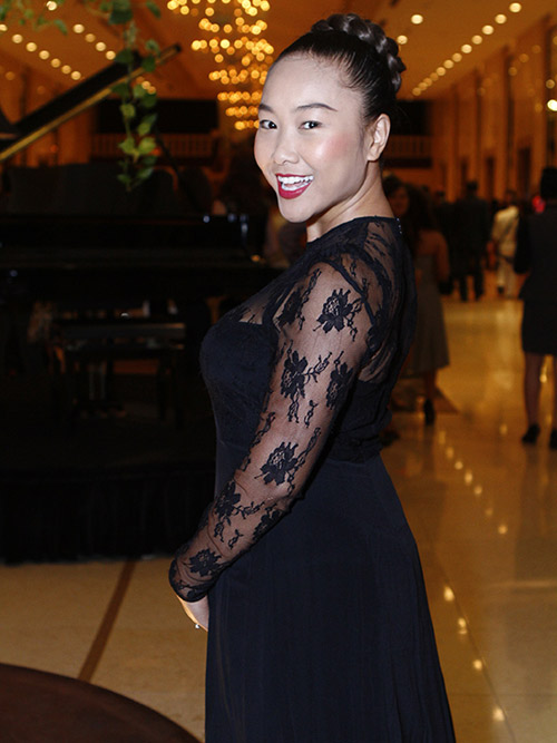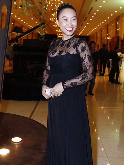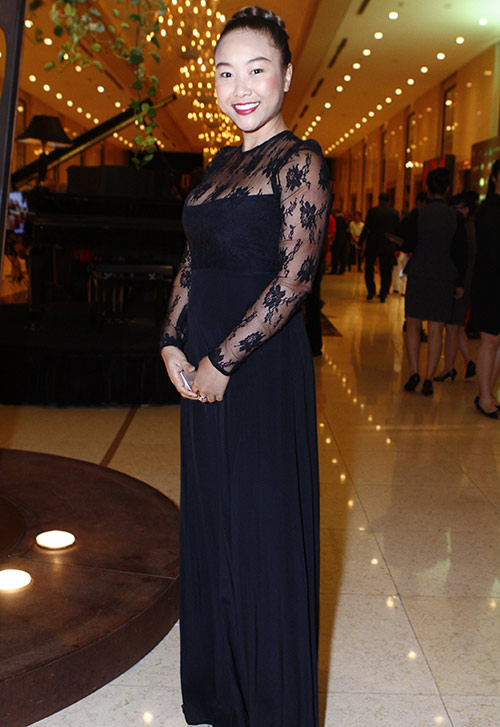 Đoan Trang lựa chọn một chiếc đầm den dài pha ren quyến rũ và che khuyết điểm mập.