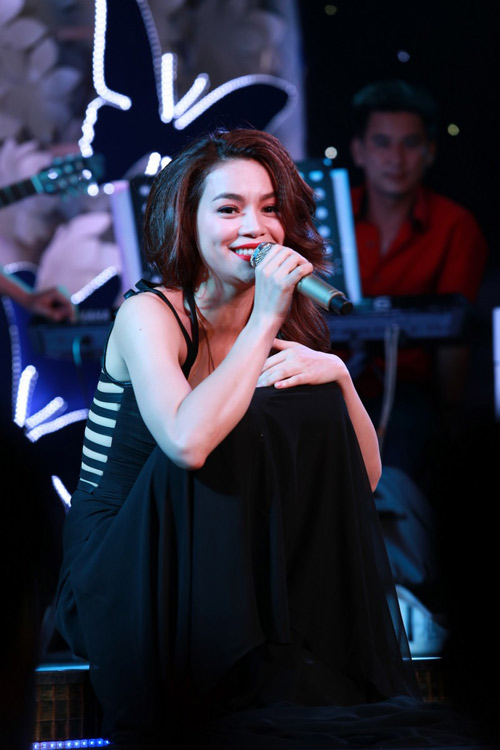 Hà Hồ còn ngồi ngay xuống sàn diễn để hát ca khúc tình cảm.