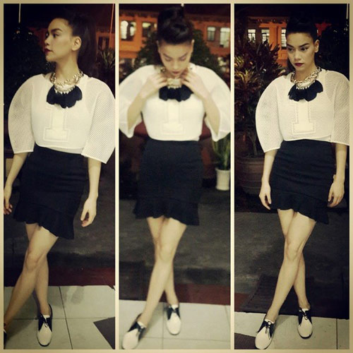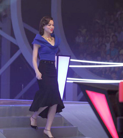 Ngôi sao được đánh giá có phong cách đường phố đẹp nhất nhì showbiz Hà Hồ thường xuyên diện váy đuôi cá ngắn. Nếu Thanh Hằng ưu tiên những gam mầu trầm như đen, nền đen chấm bi trắng thì Hà Hồ biến hóa đa dạng với váy đỏ, hồng phấn trên ghế nóng The Voice, váy đuôi cá ánh kim đi dạo phố. Thi thoảng nữ ca sĩ còn đổi gió phối chân váy đuôi cá đen với áo phông họa tiết đôi môi hay áo sơ mi thanh lịch phối cùng chân váy hồng phấn.
