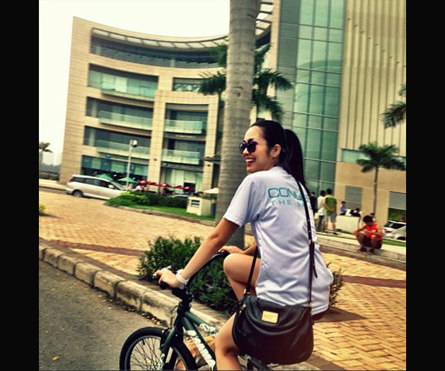 Thay vì ngồi trên những chiếc xế hộp kín đáo, Tăng Thanh Hà thích đạp xe đi lòng vòng quanh khu nhà ở, đi chơi đi dạo cùng bạn bè.