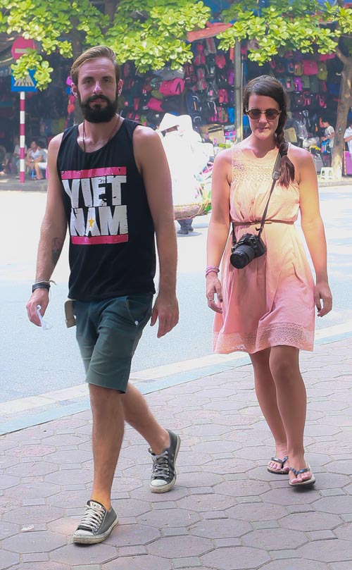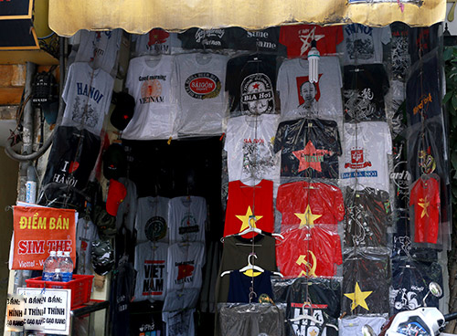“Khách tây hay mua loại áo này lắm. Có người mua vài chiếc mặc thay đổi và mang về tặng bạn bè. Mùa du lịch có ngày bán được vài chục chiếc”, Anh Xuân Hoàng, chụt một sạp áo trên vỉa hè đường Mã Mây khẳng định.