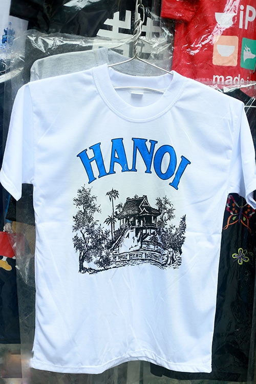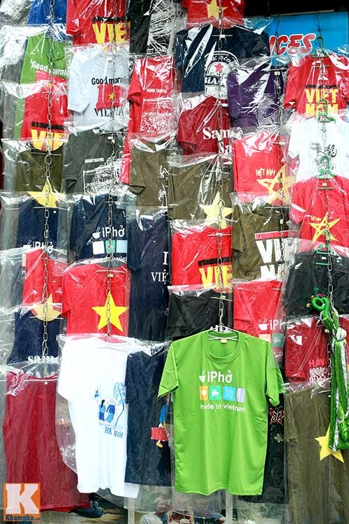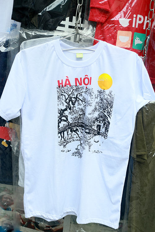 Đi dọc khu phố cổ sẽ thấy ở khắp mọi nơi từ vỉa hè đến những cửa hàng chuyên phục vụ khách nước ngoài đều la liệt mẫu áo in hình ảnh đặc trưng của Hà Nội phục vụ khách du lịch.