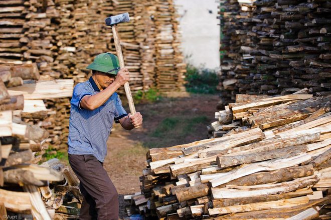 Các cây củi gỗ to dùng để đốt lò nung gốm được người dân Yên Lãng chẻ nhỏ, chất thành đống lớn và phơi khô tự nhiên trong mưa nắng .
