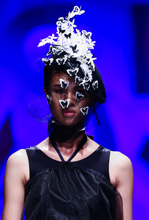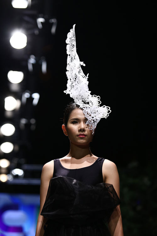 Những chiếc nón thiết kế bằng chất liệu ren tạo nên sự nổi bật cho người mẫu trên sàn diễn