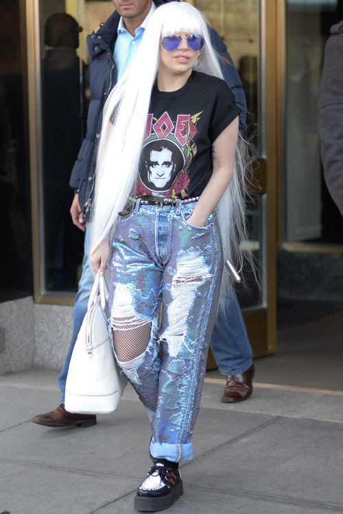 Lady Gaga với chiếc quần rất độc đáo. Cô mặc cùng áo thun đen và đi giầy bánh mỳ