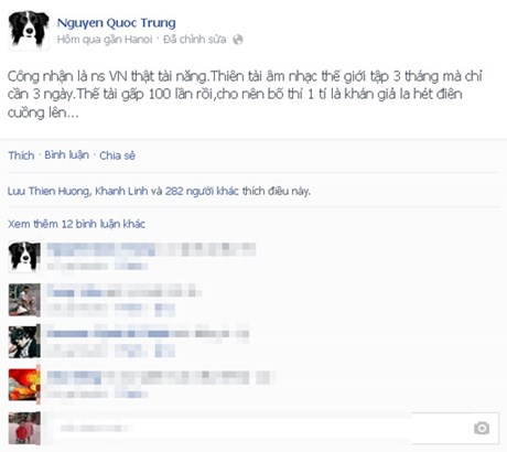 Trên trang cá nhân, nhạc sĩ Quốc Trung viết: "Công nhận là ngôi sao Việt Nam thật tài năng.Thiên tài âm nhạc thế giới tập 3 tháng mà chỉ cần 3 ngày.Thế tài gấp 100 lần rồi,cho nên bố thí 1 tí là khán giả la hét điên cuồng lên.."