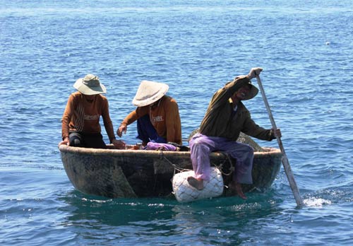 Người dân trở về sau một đêm đi câu trên thuyền thúng