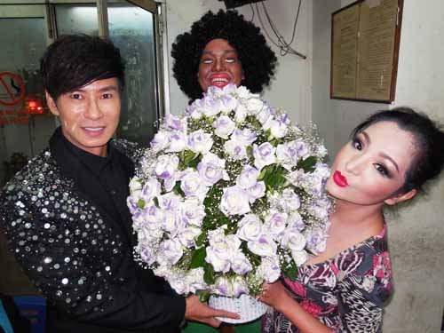 Ca sĩ Lý Hải tặng Thúy Nga một giỏ hoa chúc mừng liveshow thành công.
