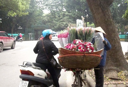 Không còn nằm gọn trong đôi quang gánh như trước đây, hoa tươi bây giờ được cho vào những thúng, mẹt để ở yên sau xe đạp theo các chị đi mọi nẻo đường. Hoa buổi sáng sớm còn vương những giọt sương mai, bình dị. Dạo quanh các con phố như Thanh Niên, Phan Đình Phùng, đê Yên Phụ… có thể dễ dàng bắt gặp dáng đạp xe âm thầm, cần mẫn như thế.